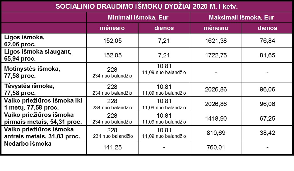 Kaip ir iki šiol, šių išmokų dydis priklausys nuo gyventojo draudžiamųjų pajamų, bet padidėja minimalių ligos, motinystės, tėvystės, vaiko priežiūros, nedarbo išmokų dydžiai, bei paauga maksimali ligos, tėvystės, vaiko priežiūros, nedarbo išmokų riba.Lentelėje pateikti išmokų dydžiai neatskaičius įmokų ir mokesčių. Svarbu, jog nauji dydžiai neturės įtakos šiais metais paskirtoms išmokoms - jie bus taikomi tik naujoms 2020 metais paskirtoms išmokoms. Be to, minimalios motinystės, tėvystės ir vaiko priežiūros išmokos keisis nuo antrojo ateinančių metų ketvirčio, o maksimali išmokų riba keisis kiekvieną ketvirtį priklausomai nuo vidutinio darbo užmokesčio.